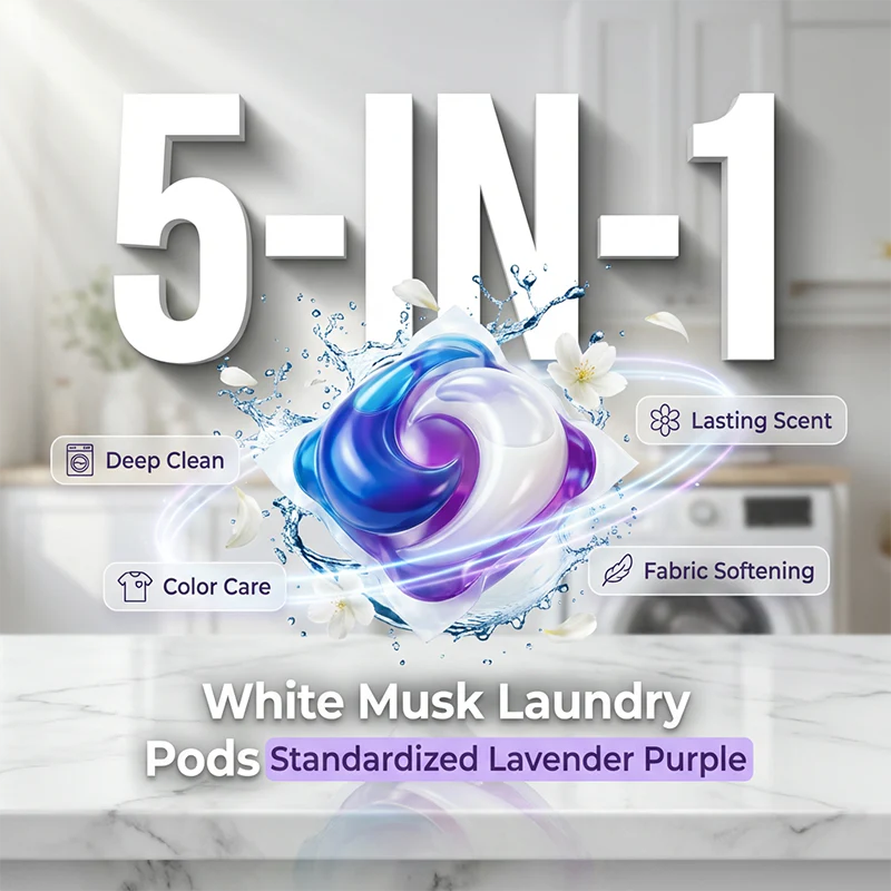 Experience the ultimate convenience with our 5-in-1 laundry pods. Infused with a luxurious white musk scent, they deliver powerful stain removal and vibrant color protection.